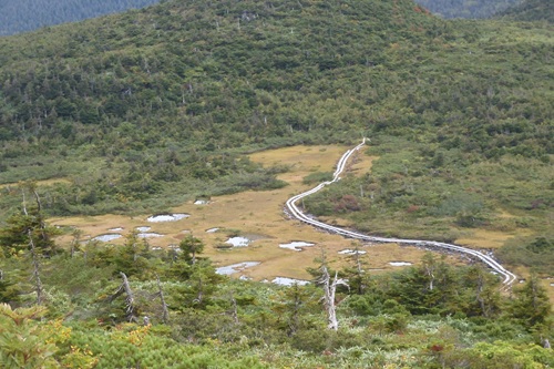 コースはいつもの西吾妻でも西吾妻山とは逆方向、人形石より先の縦走路の、風光明媚な池塘群・小凹(こくぼ)の手前まで。