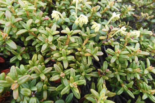 春に小さな花を咲かせる、常緑のミネズオウ(峰蘇芳/ツツジ科ミネズオウ属)。