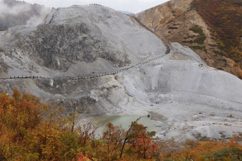 ここは塩酸酸性の熱水の噴出により広範囲にわたって凝灰岩が珪化し、灰白色の景色となっているのです。死を思わせる、まさしく地獄のような景色の連続。