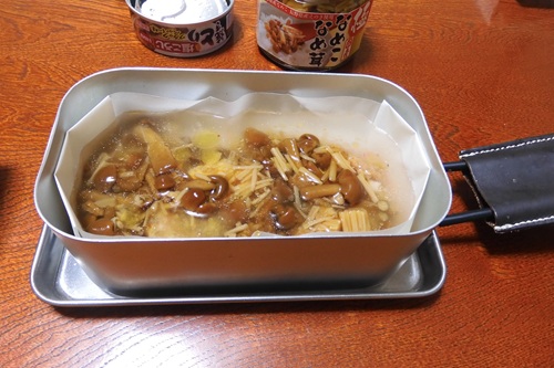 夕食はメスティン(洋式飯盒)にて、鶏の缶詰にナメコとエノキダケミックスを加えて炊き込みご飯をつくりました。米は事前に1合分を用意してきました。