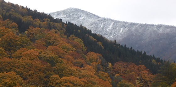 秋田湯沢の高松(泥湯)は緯度が高いとはいえ、たかだか1,300メートルの山に、もう雪です。