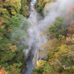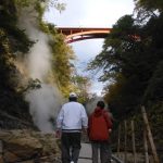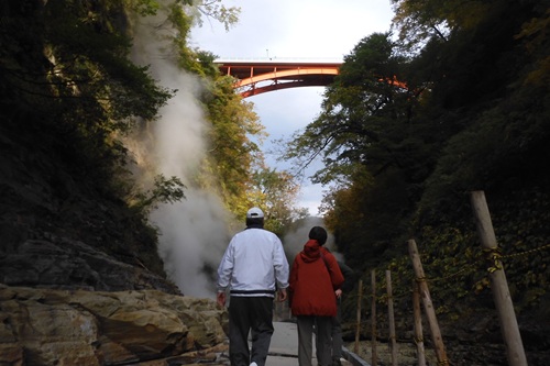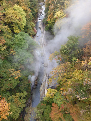 V字に深く切れこんだ皆瀬川から噴き上げる熱水と蒸気です。