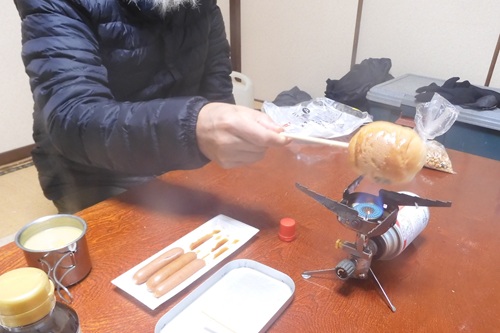 ある朝は、バターロールに箸を突きさして、バーナーで焼いて。グッドアイデア!(笑い)