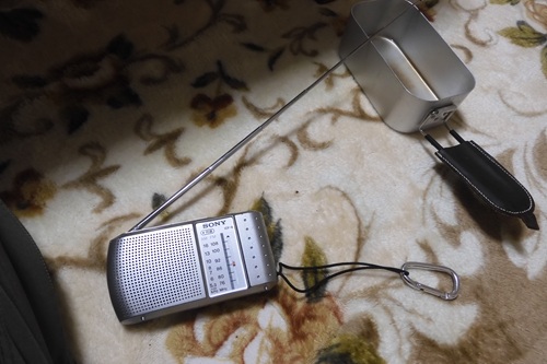 せめてラジオぐらいはと思って持ち込んだものの、電波はきわめて弱く、FMの電波を少しでも拾おうとメスティンのアルミにアンテナを掛けて(笑い)。