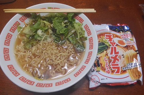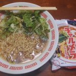 翌日の夜には袋ラーメン。コンビニの生野菜サラダを入れて。