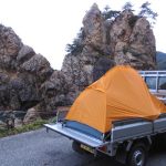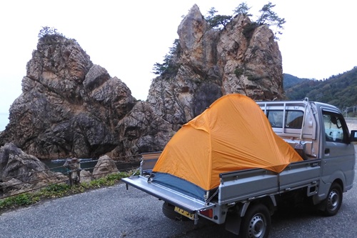 参りました。眠るなんてとんでもないこと、暴風で車自体が揺れるし、自分が重しになっていなければすぐにもテントはバラバラになって飛ばされそう、もうまったく生きた心地がしない一夜だったのです(-_-;)(笑い)。