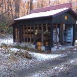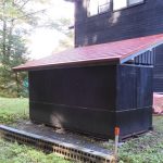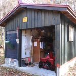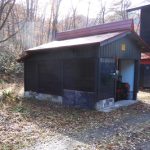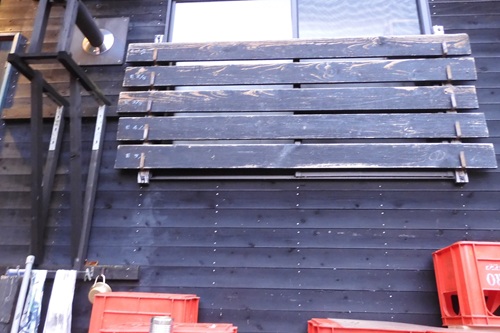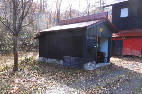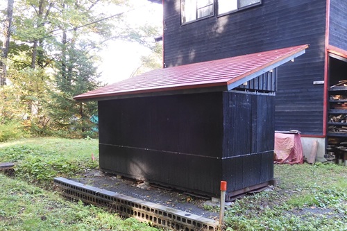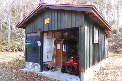 除雪機を格納し材料置き場ともしている小屋(リス小屋…リスの看板をつけているので)に、板を落として壁をつくって、雪囲い。