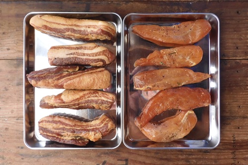 燻製は冷燻が最高の品質を約束するけど、それはこれよりもっともっと大がかりなものにしないと無理です。ですが、温燻でもこのくらいの温度なら十分な品質に仕上がります。