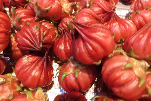 ローゼルを調べれば、アオイ科フヨウ属なのだそうで、萼(がく)と苞(ほう)の肥大した部分は生食も可、ジャムやゼリーや果実酒にも、との説明があります。