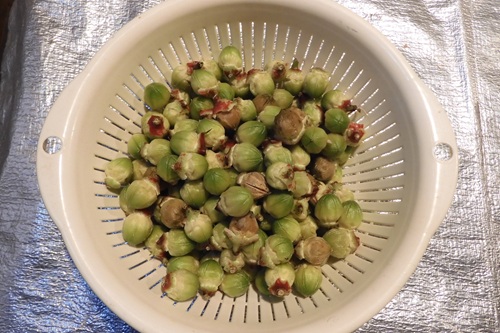 愛用のオピネルのナイフを使っての、ムサい(手がかかって根気のいる)作業、一心不乱に皮をむきました(笑い)。