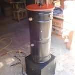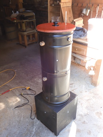 ガソリンスタンドでもらったオイル缶をふたつ組み合わせ、その下には材料をできるだけ熱源から遠ざけて低温燻製にするための台をつくって高さを出しています。