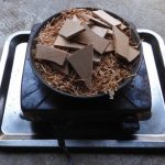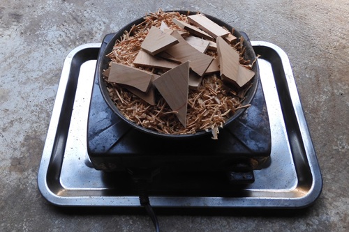 木工作業で出たサクラのかんな屑を燻煙材として電熱器に載せて、端片をさらに載せて。