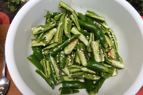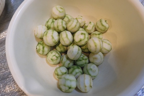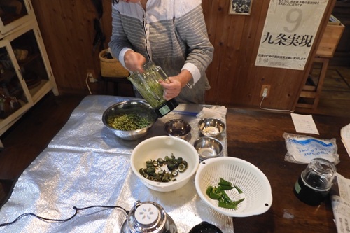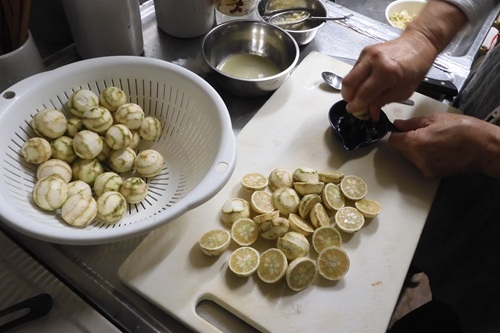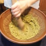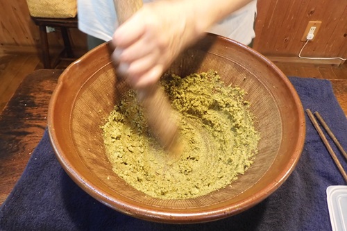 塩を加え、果汁を加えて、すり鉢で擦り…、