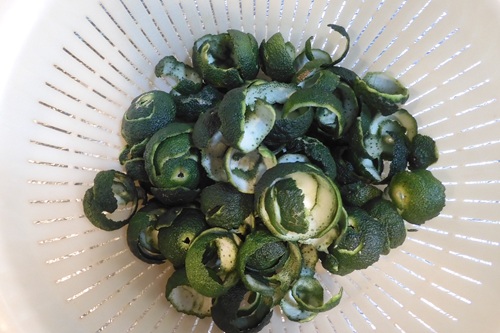 果汁は青柚子胡椒つくりの時のために加えることとし、残ったものは冷凍してポン酢替わりにして使います。