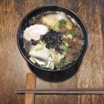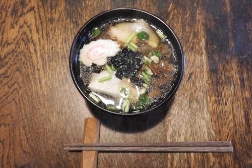 雑煮には塩蔵していた山のナメコや(滑子)やクリタケ(栗茸)などを戻して、それから鶏肉に、なるとや岩海苔やセリを添えて。